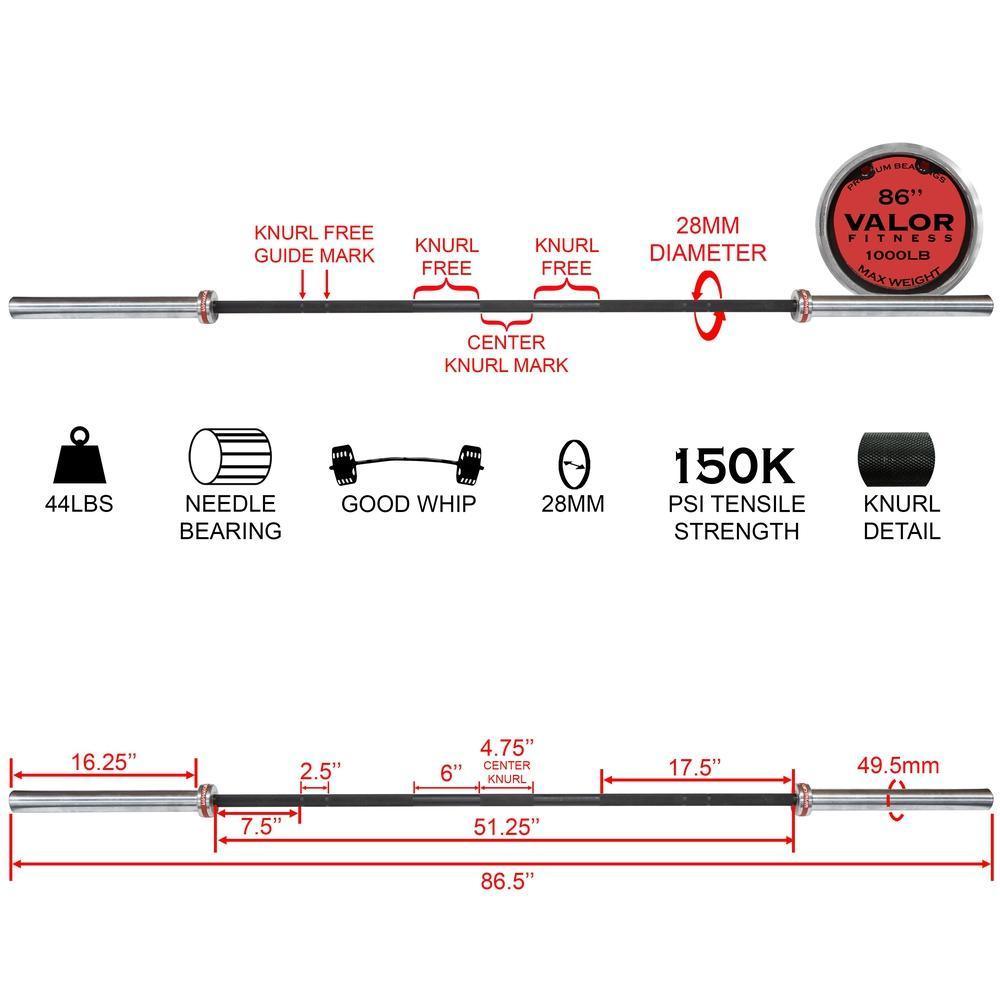 - KNURLING FOR GRIP & CONTROL: Medium-depth knurling with dual knurl-free guide marks helps lifters maintain a solid grip and chalk hold without excess abrasiveness. The 44 lb bar includes a center knurl for added grip during heavy lifts, while the 33 lb bar omits center knurling for comfort on cleans.