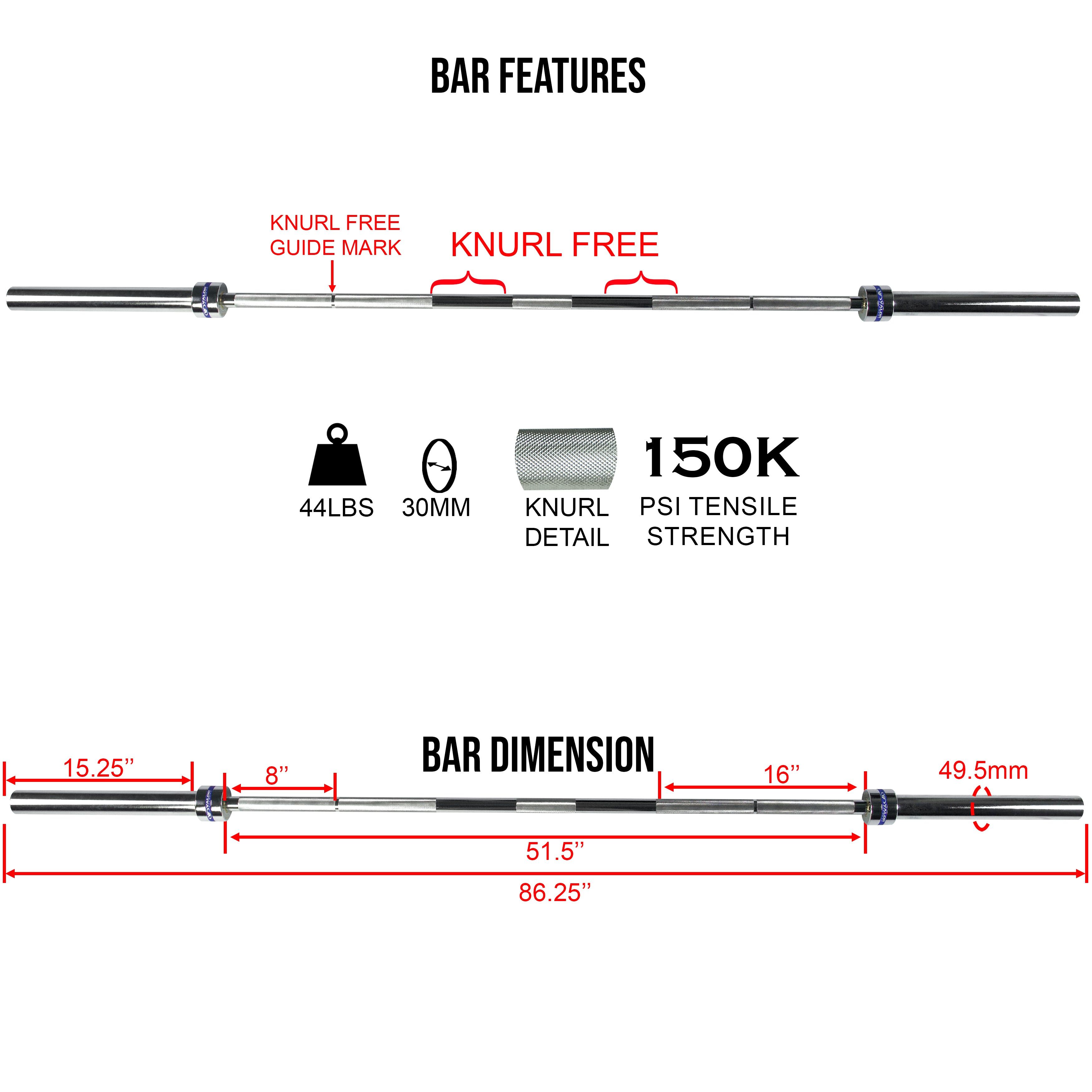 CENTER KNURL FOR STABILITY: Includes center knurling to improve bar grip during back squats and help keep the bar secure across the shoulders.