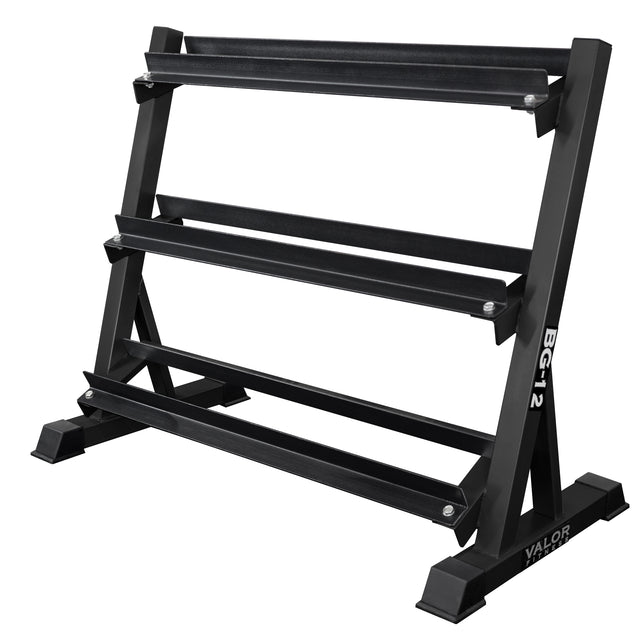 - ANGLED SHELVES: Three shelf tiers (36.5" long) are set at a slight forward angle to make it easier to grab and re-rack your dumbbells while clearly displaying the weight markings for quick identification.