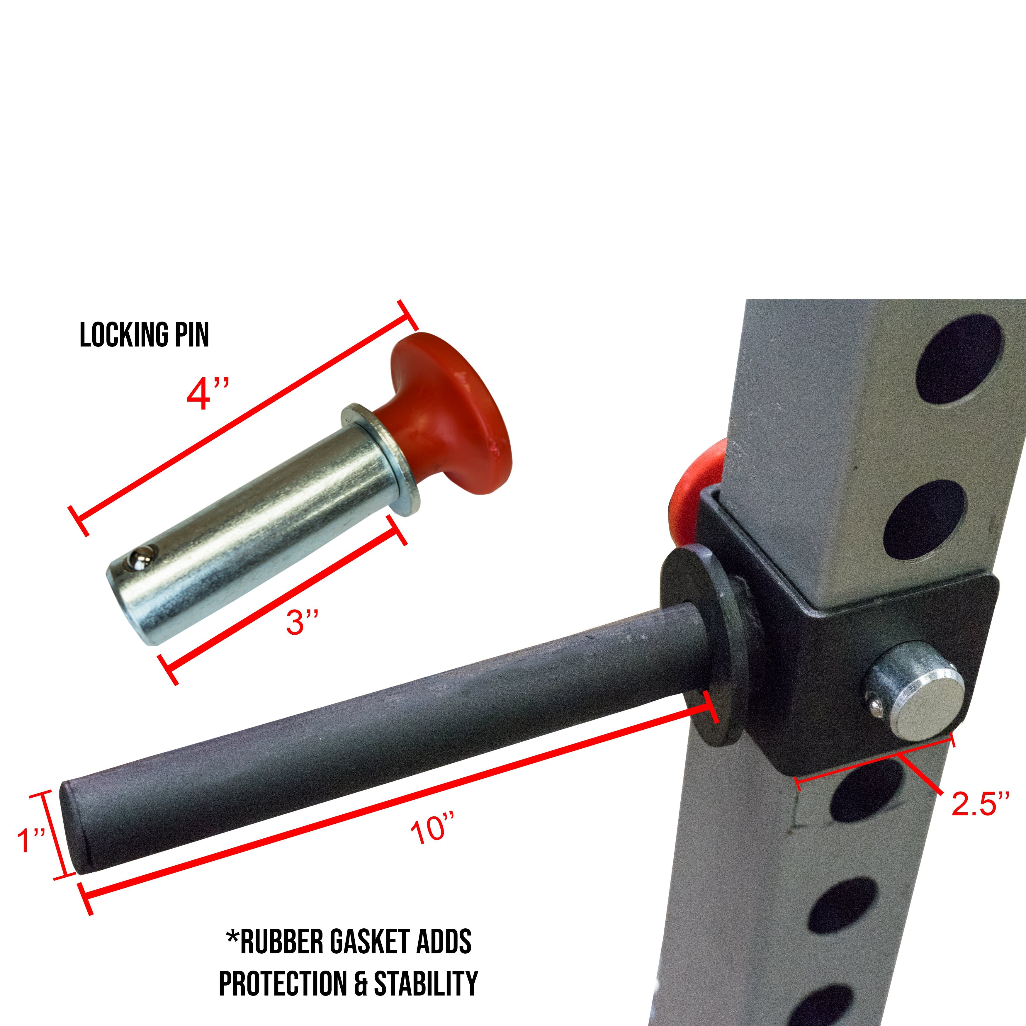 - ADJUSTABLE: Easily attaches to power rack frames by pulling the red popper pin and sliding the attachment into place. Provides the ability to change the height of plate storage at any time.