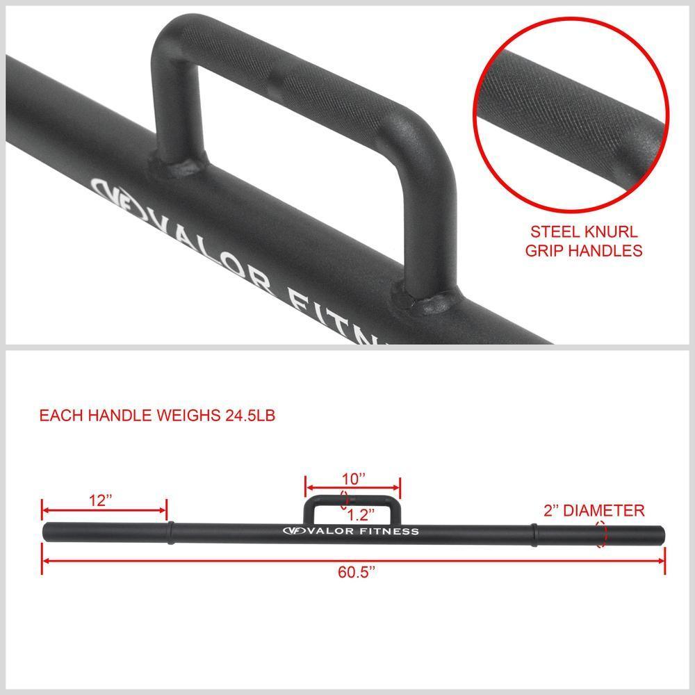 - DIMENSIONS: Each handle measures 60" long, with 12" of loadable sleeve length on each side of each handle. Shaft and sleeves measure 2" in diameter to accommodate Olympic bumper plates. Farmers carry handles weigh 24.5 lb each.