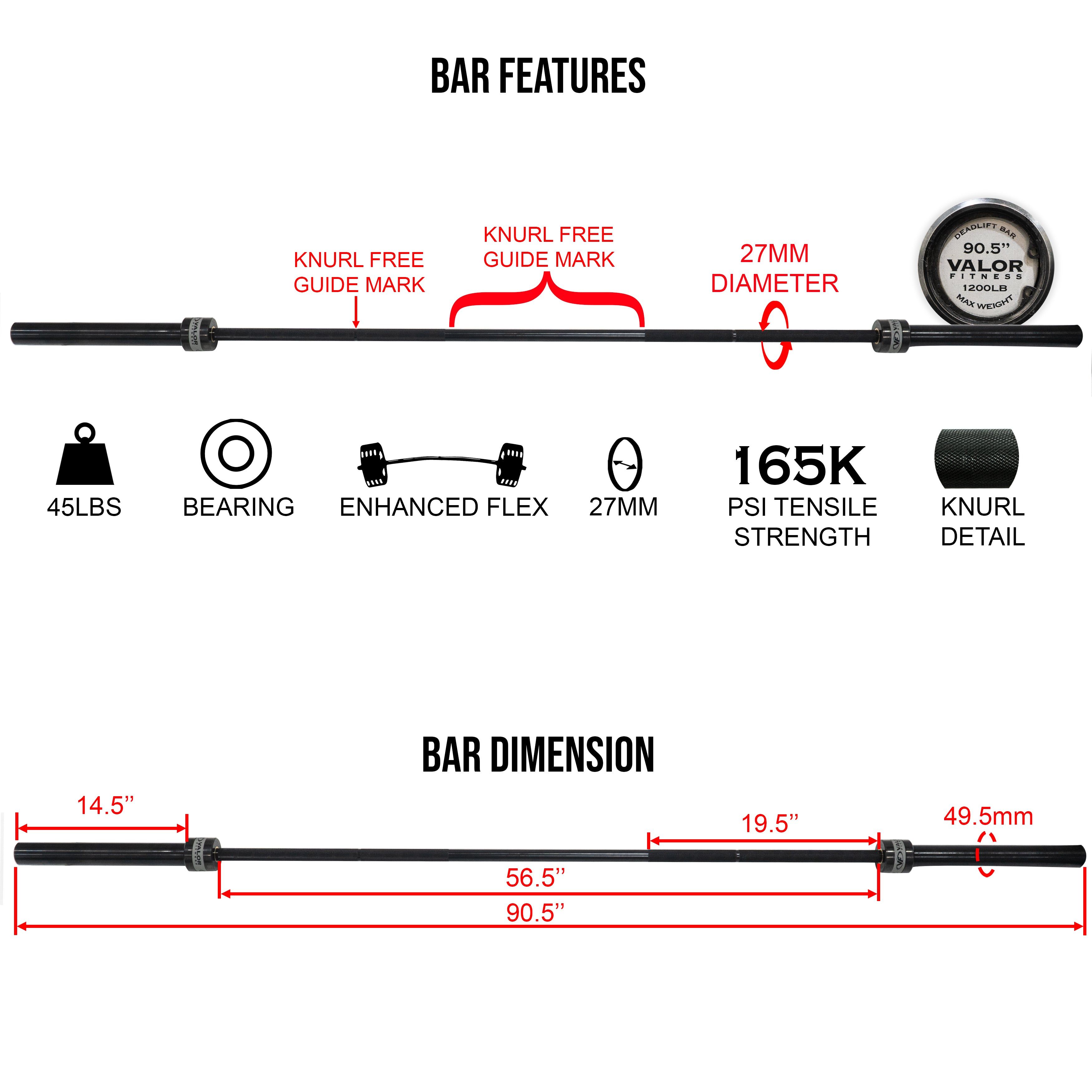 • ENHANCED BAR FLEX: The barbell measures 90.5" in length, allowing each 14.5" sleeve to be further from the center of the bar, placing plates further from the center. Combined with the thinner bar diameter of 27 mm (compared to the 28-29 mm of an Olympic barbell), this makes it easier for you to initiate the pull higher and deadlift heavier weight off the floor. Reset the dead lift bar between lifts to straighten the bar.